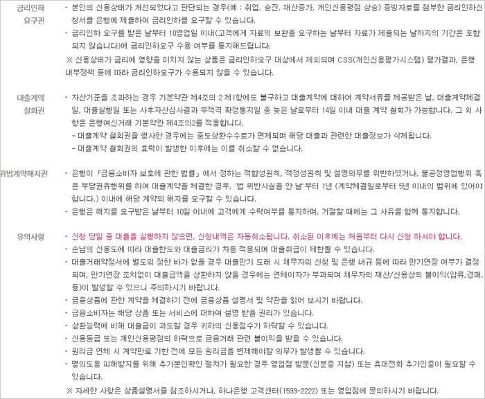 참고로, 하나원큐 비상금대출 상품은 금리인하 요구권 및 대출계약 철회권, 위법계약 해지권 신청이 가능합니다.