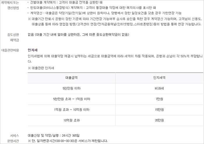 대출관련비용으로서는 인지세가 있는데요. 은행과 고객이 각 50%씩 부담한다고 해요. 다만, 5천만원 이하는 비과세라고 합니다. 하나은행 비상금 대출 신청 및 약정/실행은 주말 공휴일 포함 24시간, 365일이라고 하는데요. 다만 일자변경시간(00:00~00:30)은 서비스가 제한된다고 해요.