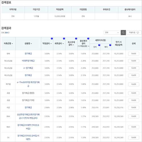 설정한 조건에 따라 모든 저축은행의 정기예금 상품 금리 정보가 화면에 나타납니다.