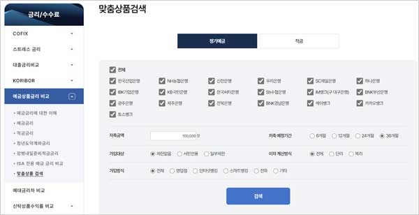 - 금융 권역: 시중은행, 지방은행, 외국계 은행 등 조회하고자 하는 은행의 범위를 선택합니다. (모든 은행을 선택하여 가장 높은 금리를 비교하는 것이 유리합니다.)
