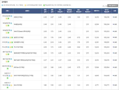 설정한 조건에 따라 모든 은행의 예금 상품 금리 정보가 화면에 나타난다고 해요.