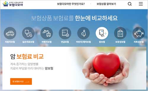 온라인 보험 슈퍼마켓 보험다모아 서비스는 국내 모든 보험사의 자동차보험, 암보험, 실손보험, 연금보험, 어린이 보험 등 다양한 상품을 한곳에서 투명하게 비교할 수 있는 통합 비교 공시 시스템이라고 하는데요.
