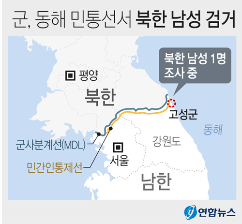 합동참모본부에 따르면 이날 오전 4시 20분께 동해 민통선에서 남쪽으로 이동하던 남성 1명이 폐쇄회로(CC)TV에 포착됐습니다. 이에 군은 작전 병력을 투입해 오전 7시 20분께 이 남성의 신병을 확보했습니다.